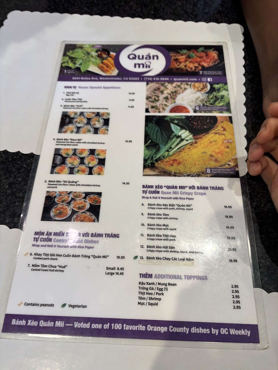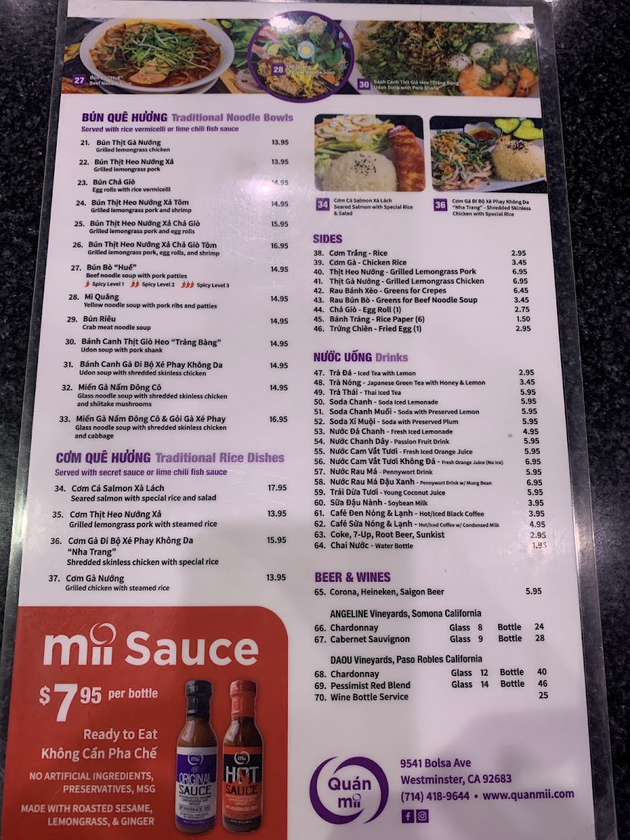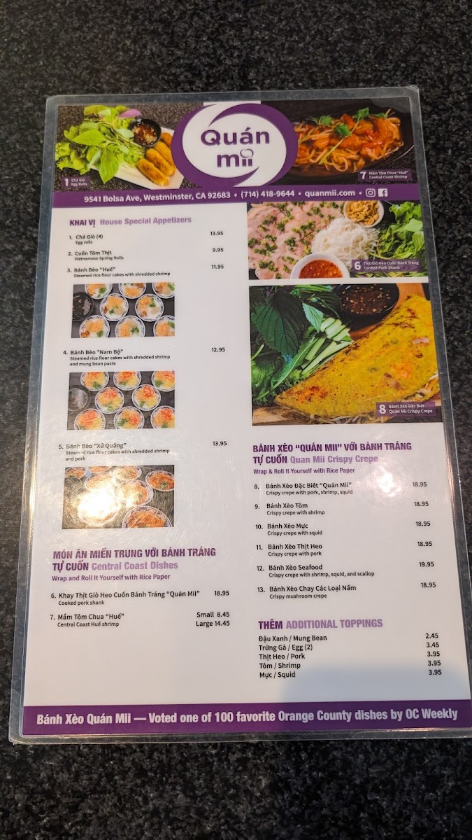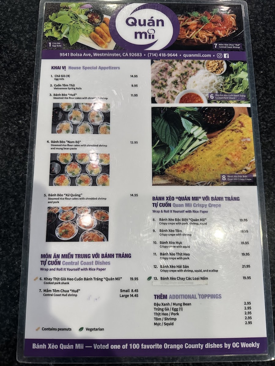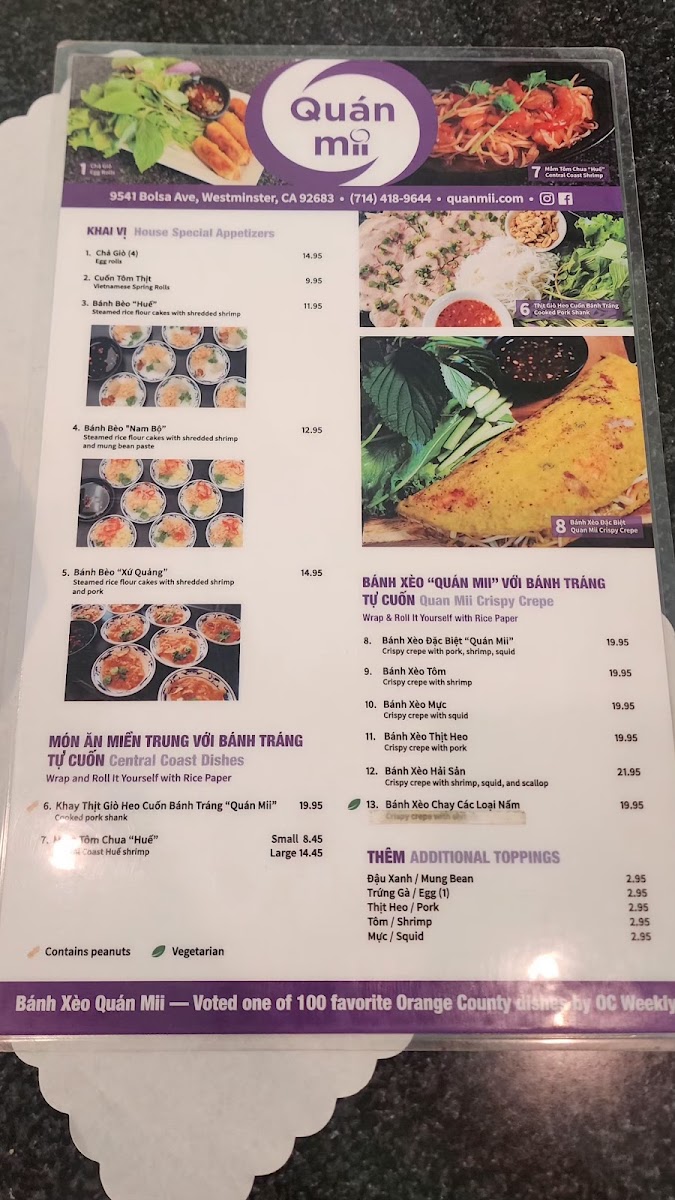 Welcome to Quán Mii Restaurant, a true gem tucked away at 9541 Bolsa Ave in Westminster, California, where the vibrant flavors of Vietnamese cuisine come to life. This delightful eatery specializes in the art of the bánh xèo, or Vietnamese crispy crepes, crafted with love and a commitment to quality. Step inside and immerse yourself in an inviting atmosphere that blends a modern dining experience with a touch of traditional charm.